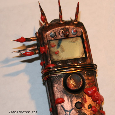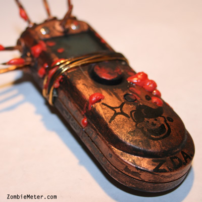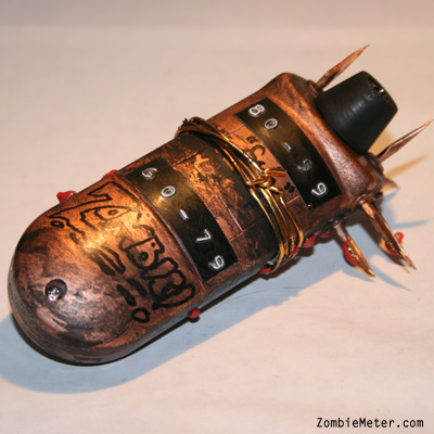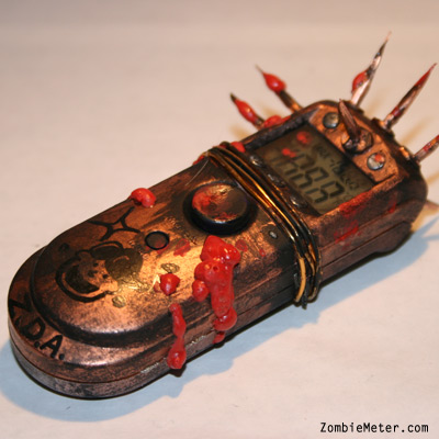 This Zombie Meter is a post-infection issue zombie survival detection meter specifically modified for battle. Use this meter to tell if someone is a zombie from a distance then take action using the attached brain-piercing blades. Simply point the ZDA Zombie Meter at someone you believe may be infected, press the button and correlate the readout number to the chart on the back differentiating 'safe' from 'zombie'. Once a zombie has been detected we urge you to take immediate action.